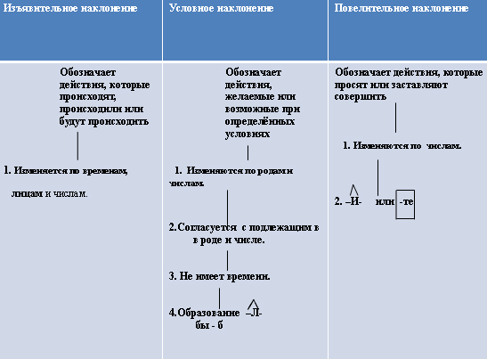 Опираясь на таблицу, расскажите о наклонениях глагола.