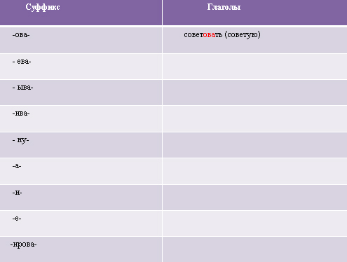 Цель: знать глагольные суффиксы, уметь делать словообразовательный и морфемный разбор глагола.