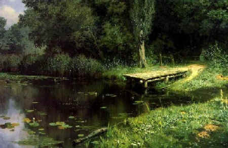 – Давайте рассмотрим картину известного русского художника В.Д.Поленова “Заросший пруд”. Что общего в этих двух произведениях? (Зелёный берег весь в цветах, лилии и кувшинки в пруду…)
