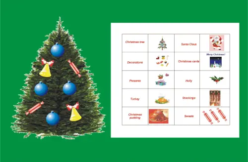 Teacher: Today is the Christmas Eve, the 24-th of December. We need to get ready for the greatest English holiday of the year, so we will decorate a Christmas tree, write Christmas cards, and sing a song. We have 3 teams for a competition. You can get some of these decorations. We need 3 persons who will decorate our Christmas tree. P1, P2, P3.