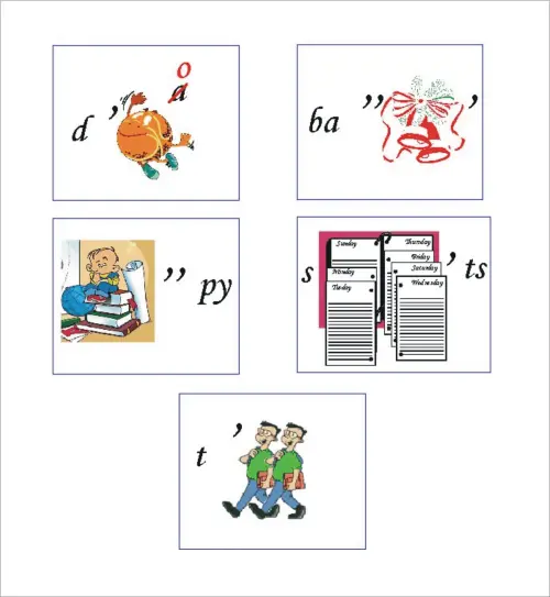 Teacher: Solve the rebuses. If you do it you will know what presents Santa Claus brings for children. Write the words. (Группы получают ребусы и разгадывают их. За каждое правильно разгаданное слово получают украшение для елки.)