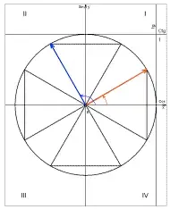 2) нахождение угла поворота начального радиуса с учетом области значений обратной тригонометрической функции.