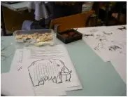 Несколько человек выполняет рисунок мягким материалом (соусом, углем или сангиной) по тонированной поверхности, имитирующей скалу, а остальные ученики выполняют амулеты.