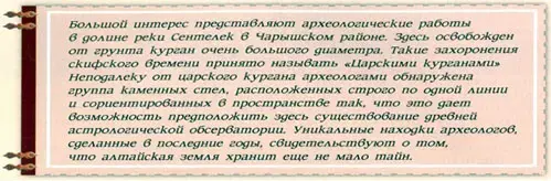 В долинах Горного Алтая до сих пор возвышаются большие и малые курганы, сооружения из земли и камней. В последние годы наиболее известным стал курган, расположенный в долинах Ак-Алака. Археологи установили, что в курганах похоронены люди, жившие две с половиной тысячи лет назад. Курганы известны не только в горах, их много и на равниной части Алтайского края.