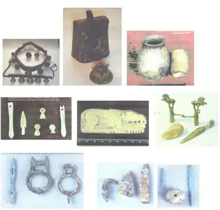 Найдены бусы, серьги, наконечники стрел, ножи, многочисленные керамические сосуды, курильницы алтари из камня, зернотерки, костяные орудия труда, украшения, выполненные в скифо-сибирском зверином стиле, и многое другое.