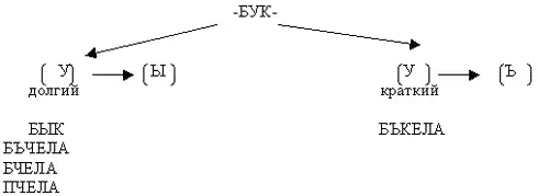 Глагол букать у древних славян означал "мычать, реветь", то есть издавать низкий, протяжный звук. В корне -бук- звук у мог произноситься долго. Впоследствии такой долгий у превратился в ы - получился бык. Но у мог произноситься и очень кратко и обозначался особой буквой -ъ (ером), как и другой краткий звук о. Отсюда второй "мычащий зверь" выглядел так: бъчела. Затем краткий у исчез и получилось бчела. Однако сочетания бч оказалось довольно трудным для произношения. Следовало, чтобы оба звука стали либо звонкими, либо глухими. Так и получилось: украинский язык выбрал первое - бджола, русский - второе - пчела. И действительно, бык и пчела похожи: упитанные и мычат, вернее, бучат.