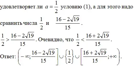 Если a ≠ 1/2, то уравнение является квадратным; чтобы оно имело не более одного корня необходимо и достаточно, чтобы дискриминант был неположителен: