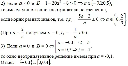 Будем решать это уравнение заменой переменных. Пусть = t , t ≥ 0 , тогда x = t2 + 8 и уравнение примет вид at2 + t + 5a - 2 = 0 . Теперь задача состоит в том, чтобы найти все а, при которых уравнение at2 + t + 5a - 2 = 0 имеет единственное неотрицательное решение. Это имеет место в следующих случаях.