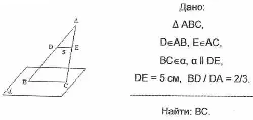На сторонах АВ и АС треугольника АВС взяты соответственно точки D и E так, что ОE = 5 см и ВD = 2/3. Плоскость a проходит через точки B и С и параллельна отрезку ОE. Найдите длину отрезка ВС.