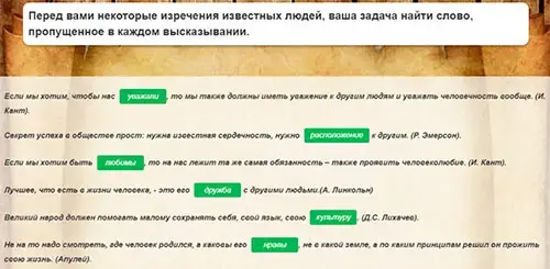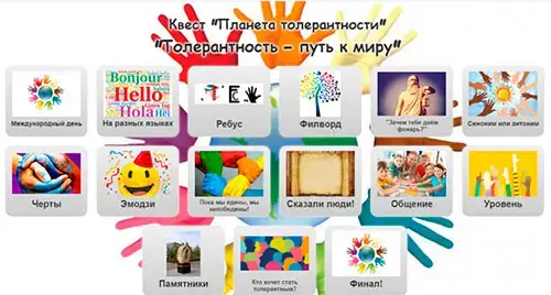 В своей жизни мы общаемся с представителями разных национальностей, культур, социальных слоёв, поэтому надо уметь уважать культурные ценности как своего народа, так и представителей другой культуры, религии, научиться находить точки соприкосновения. Кроме того, толерантность как качество личности помогает человеку адаптироваться в другой среде, к неожиданно новым для него условиям жизни. Люди, не обладающие этим качеством, проявляют категоричность, оказываются неспособными к изменениям, которых требует от нас жизнь. Сегодня все большую популярность приобретают образовательные квесты. Собственно понятие «квест» (транслит. англ. quest - поиски) и обозначает игру, требующую от игрока решения умственных задач для продвижения по сюжету. Образовательный квест - проблема, реализующая образовательные задачи, отличающаяся от учебной проблемы элементами сюжета, связанные с обработкой информации, для решения которой используются информационные ресурсы.