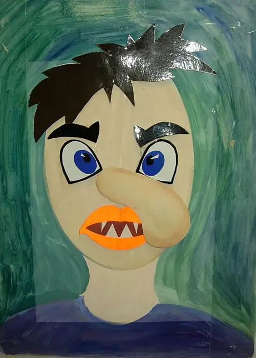 (Сделает ее лохматой, волосы раскрасит зеленой краской, нарисует ей огромный нос, изо рта торчат клыки и т. д.)