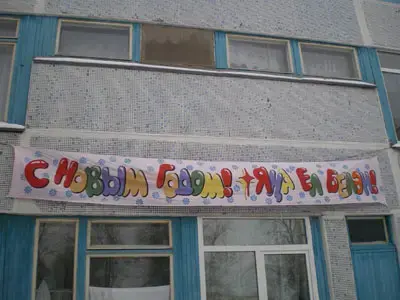 В соответствие с планом новогоднего оформления здания украшаем центральный вход, окна. Используем банеры с новогодними поздравлениями на 2-х государственных языках (русском и татарском), световые композиции, световое оформление оконных проёмов, гирлянды, украшаем в центральном холле новогоднюю елку.