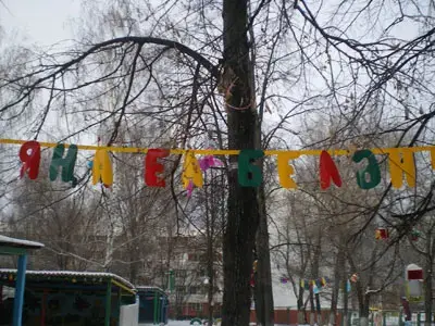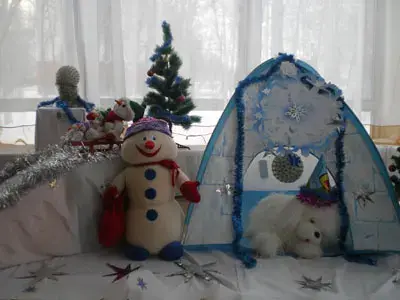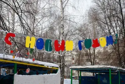 При оформлении территории нашего детского сада большое значение придаём безопасности, целесообразности, красочности, а также эстетичности построек. Ярко украшенный участок сам по себе вызывает у детей устойчивый положительный эмоциональный настрой, желание идти на прогулку. Педагоги украшают веранды гирляндами, мелкими мягкими игрушками, флажками разнообразной конфигурации, упаковками от новогодних подарков, на ветки деревьев прикрепляют вертушки, султанчики, снежинки, шумовые инструменты из бросового материала. Снежные постройки воспитатели украшают орнаментом из разноцветных льдинок, новогодних гирлянд, тканью, используют бросовый материал, т.к. он практичен и смотрится ярче. Между деревьями на шнуре размещают изображения Деда Мороза, сказочных героев из яркого тентового материала, поздравление (в виде гирлянд из бросового материала) «С Новым годом!» на двух государственных языках.