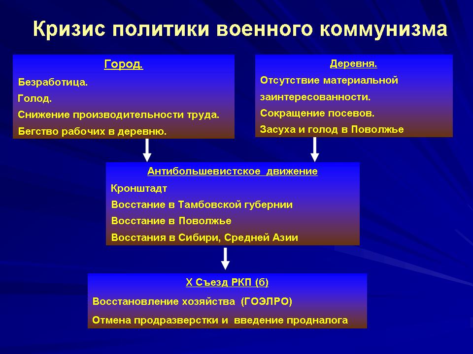 Недовольство населения экономической политикой большевиков породило крестьянские волнения, малую гражданскую войну и восстание в Кронштадте, все это вынудило большевиков отказаться от политики военного коммунизма.