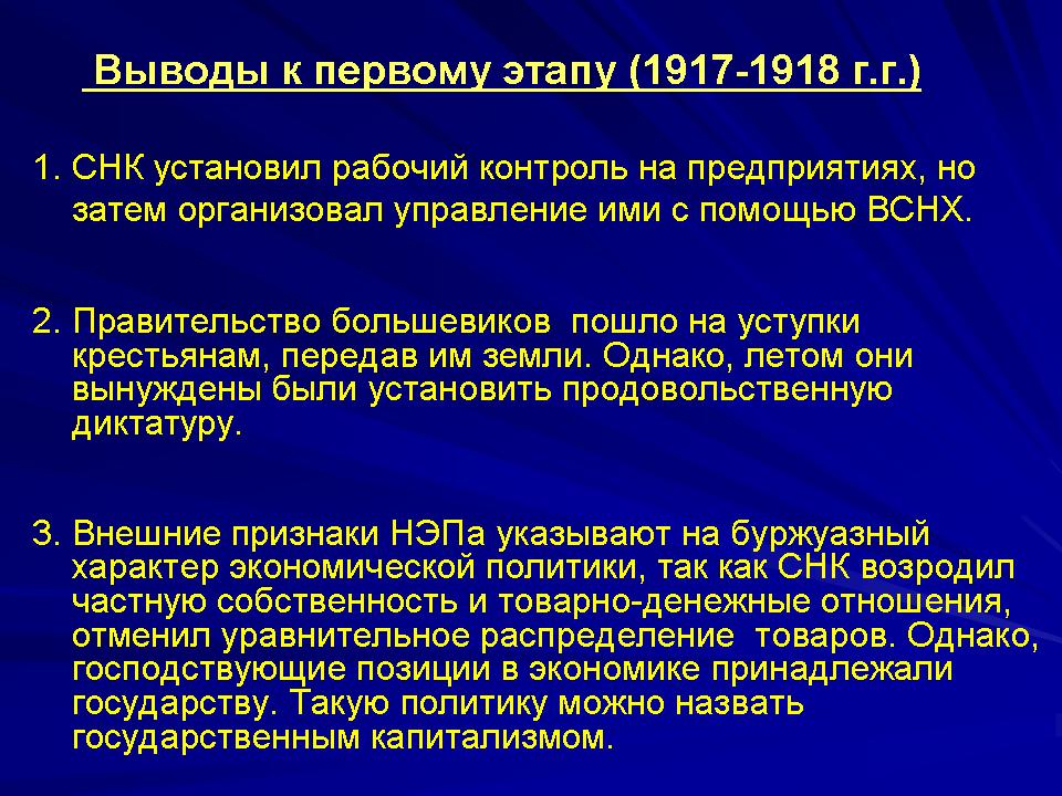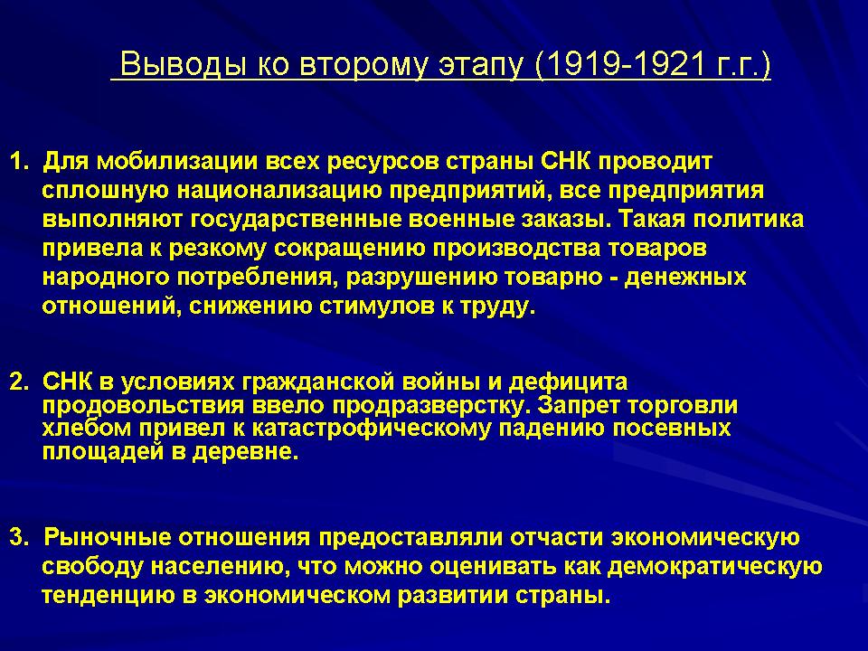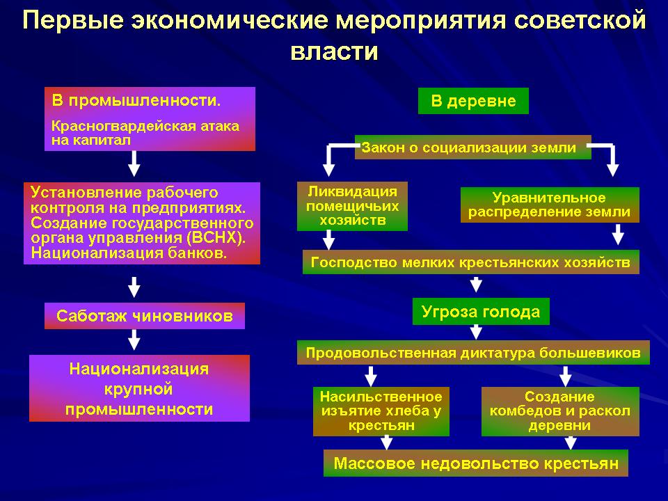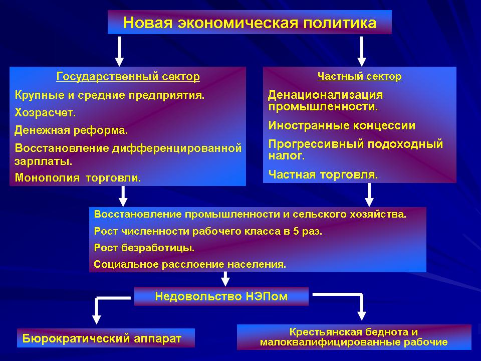 | Сельское хозяйство | Продразверстка, ликвидация частной собственности. | Продналог, аренда земли. | Право частной собственности на землю, развитие фермерского хозяйства. |