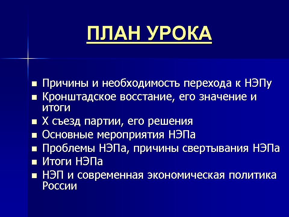 - Познакомить учащихся с основными мероприятиями НЭП, определить значение НЭП для дальнейшего развития страны;