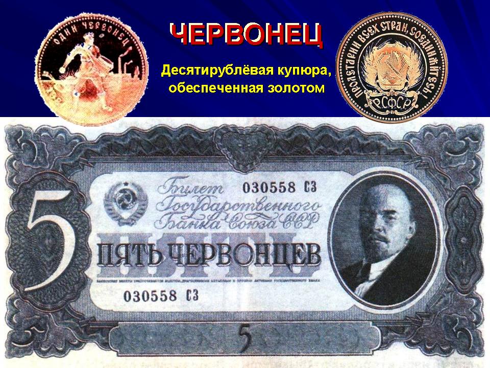 - 1922 г. – денежная реформа. Вводится золотой червонец = 60 тыс. старых рублей. Червонец = 5 долларам 15 центам США и был выше английского фунта-стерлинга;