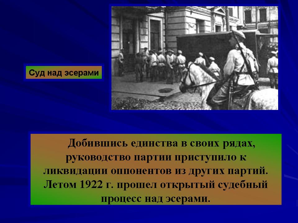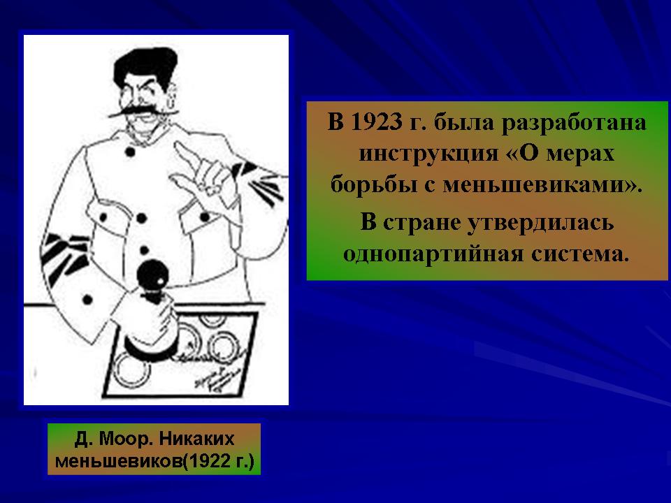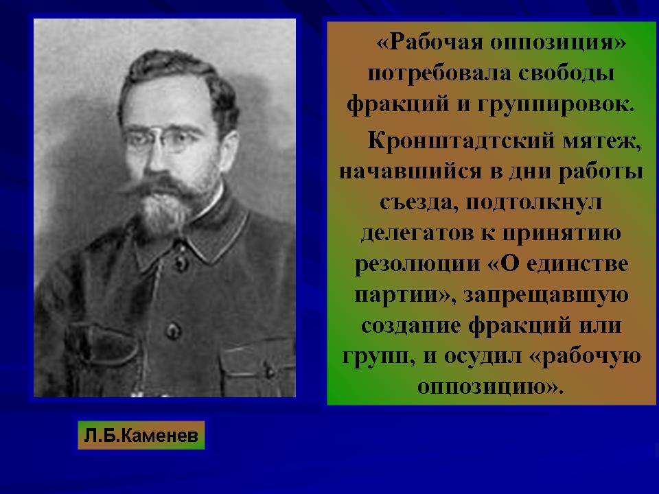 “Резолюция о единстве партии” – запрет создания фракций внутри ВКП (б). Все фракции, платформы и группы внутри партии должны были быть распущены. Нарушение этих требований влекло исключение из партии. Запрет инакомыслия и свободы мнений внутри партии.