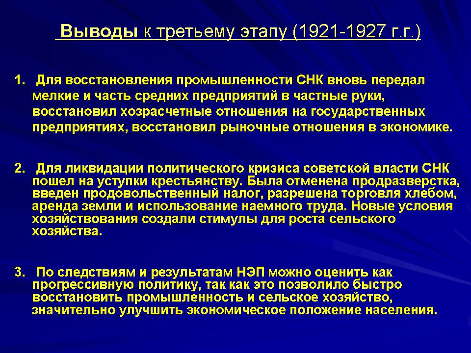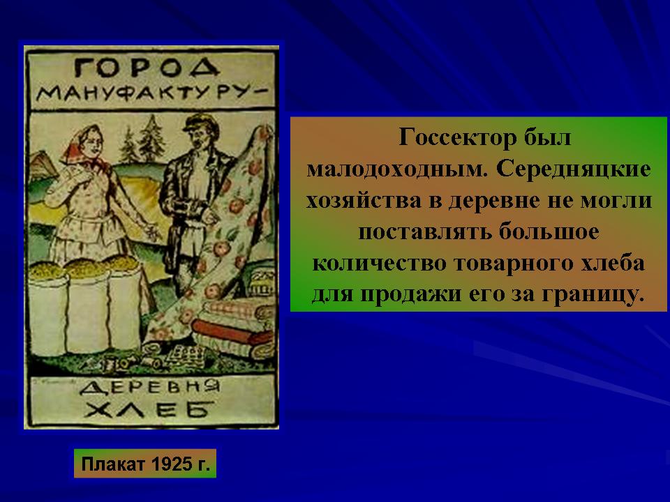 - во-вторых, к 1925 г. удалось достичь 75% выпуска продукции тяжелой промышленности; в 1,5 раза выросла производительность труда; начался выпуск новой техники; было построено 200 электростанций; резко поднялась мелкая и кустарная промышленность;