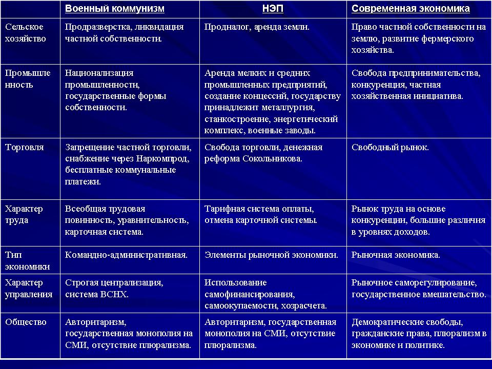 | Промышленность | Национализация промышленности, государственные формы собственности. | Аренда мелких и средних промышленных предприятий, создание концессий, государству принадлежит металлургия, станкостроение, энергетический комплекс, военные заводы. | Свобода предпринимательства, конкуренция, частная хозяйственная инициатива. |