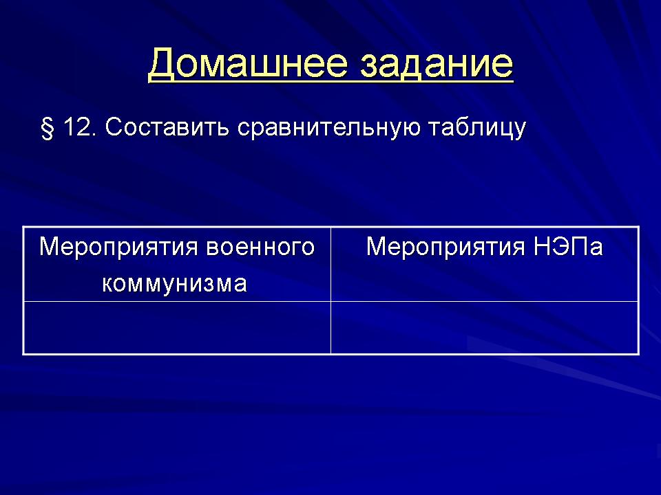 | Мероприятия военного коммунизма | Мероприятия НЭПа |