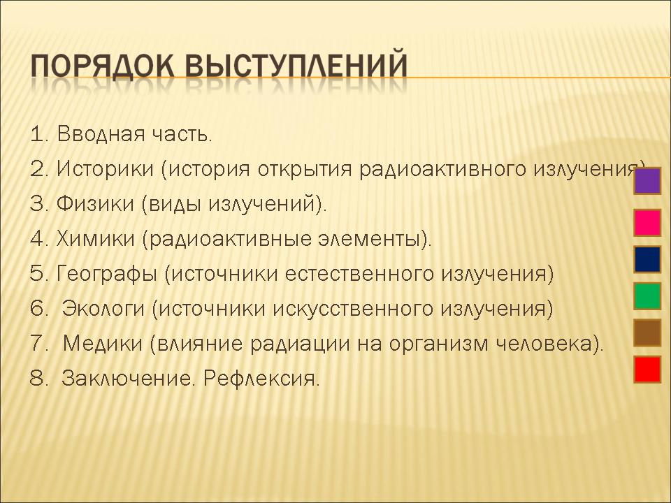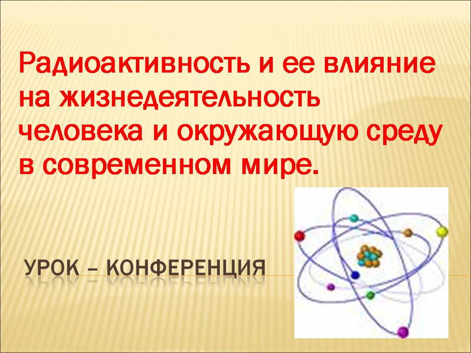 Введение: Обойтись без использования радиоактивности человечество в современном мире не может. Мы применяем эти явления практически во всех областях деятельности: для получения энергии, медицине, археологии, дефектоскопии, селекции. Однако надо помнить, что абсолютно безопасных технологий не бывает и в каждом случае необходимо оценивать степень пользы и риска. Выступления учащихся сопровождаются демонстрацией слайдов. Презентация.