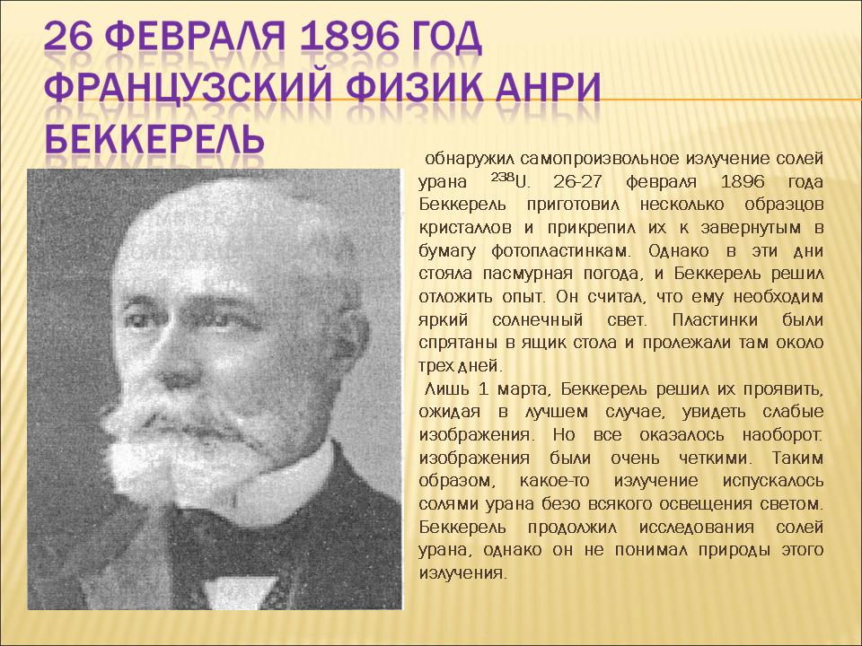 26 февраля 1896 год французский физик Анри Беккерель обнаружил самопроизвольное излучение солей урана 238U. 26-27 февраля 1896 года Беккерель приготовил несколько образцов кристаллов и прикрепил их к завернутым в бумагу фотопластинкам. Однако в эти дни стояла пасмурная погода, и Беккерель решил отложить опыт. Он считал, что ему необходим яркий солнечный свет. Пластинки были спрятаны в ящик стола и пролежали там около трех дней. Лишь 1 марта, Беккерель решил их проявить, ожидая в лучшем случае, увидеть слабые изображения. Но все оказалось наоборот: изображения были очень четкими. Таким образом, какое-то излучение испускалось солями урана безо всякого освещения светом. Беккерель продолжил исследования солей урана, однако он не понимал природы этого излучения.