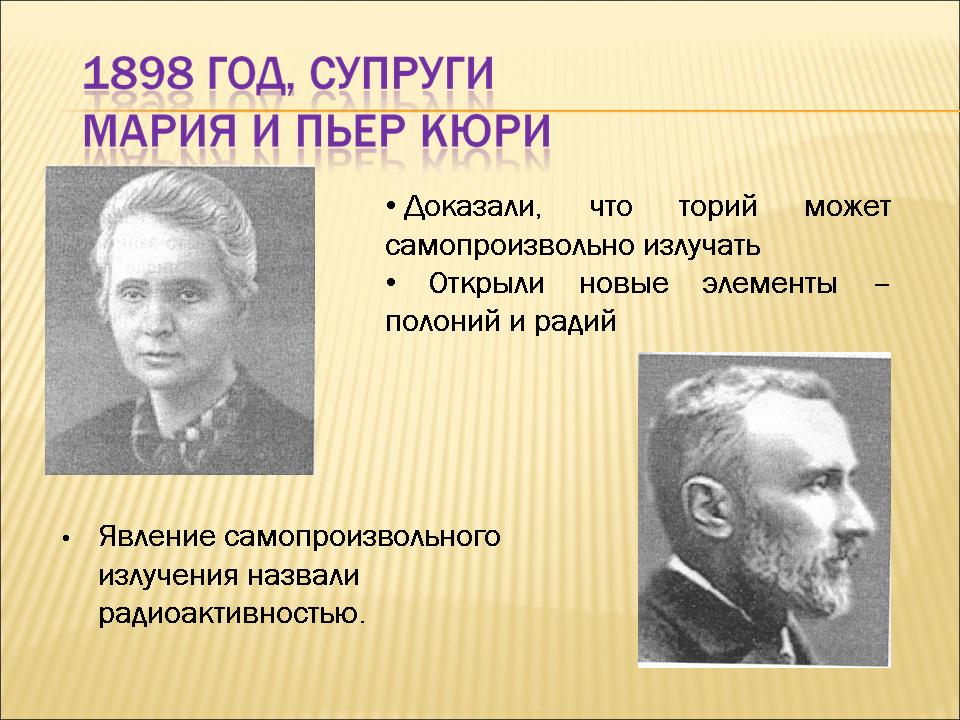 1898 год, супруги Мария и Пьер Кюри доказали, что торий может самопроизвольно излучать. Открыли новые элементы - полоний и радий