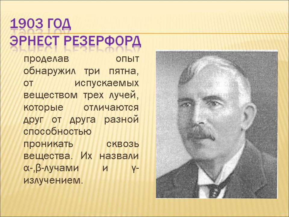 1903 год Эрнест Резерфорд проделав опыт обнаружил три пятна, от испускаемых веществом трех лучей, которые отличаются друг от друга разной способностью проникать сквозь вещества. Их назвали ?-,?-лучами и ?-излучением.