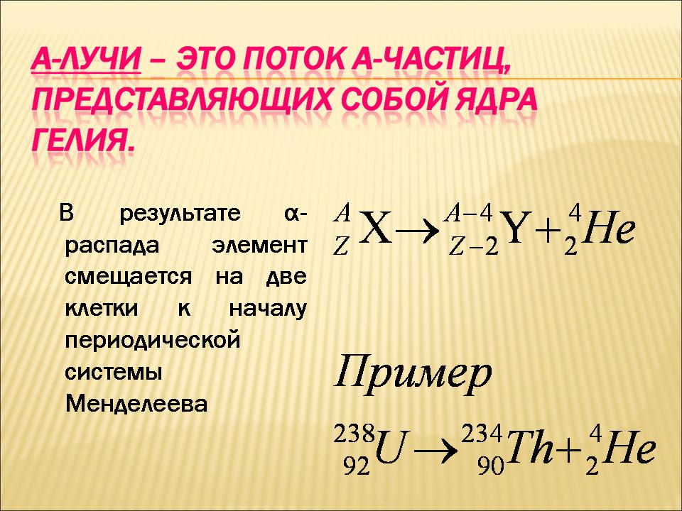a-лучи - это поток ?-частиц, представляющих собой ядра гелия. В результате ?-распада элемент смещается на две клетки к началу периодической системы Менделеева