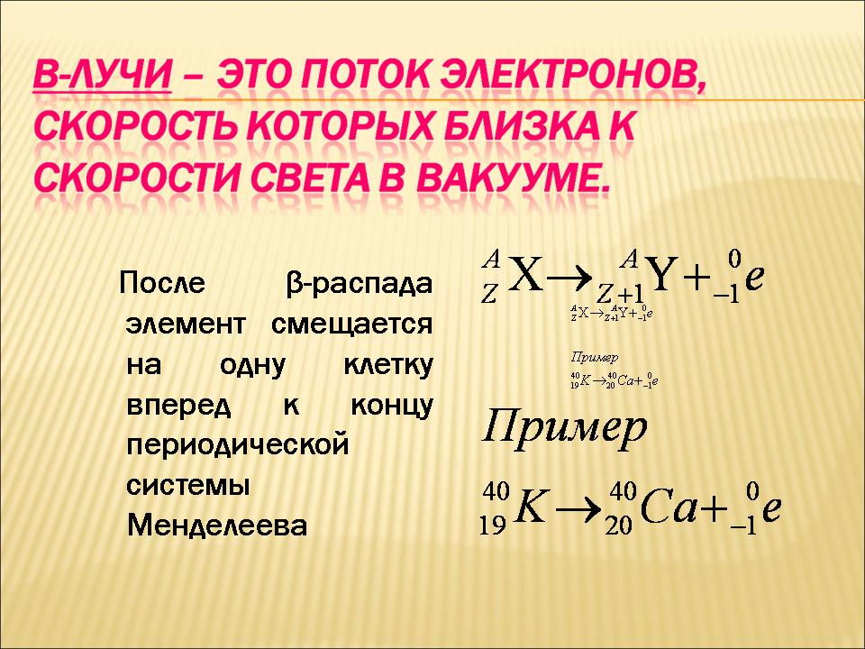 B-лучи - это поток электронов, скорость которых близка к скорости света в вакууме. После b-распада элемент смещается на одну клетку вперед к концу периодической системы Менделеева