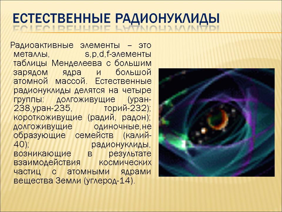 Радиоактивные элементы - это металлы, s,p,d,f-элементы таблицы Менделеева с большим зарядом ядра и большой атомной массой;