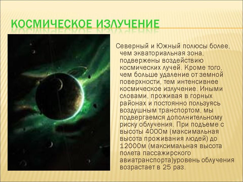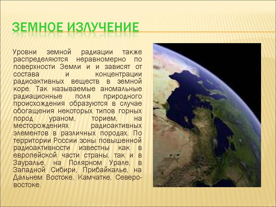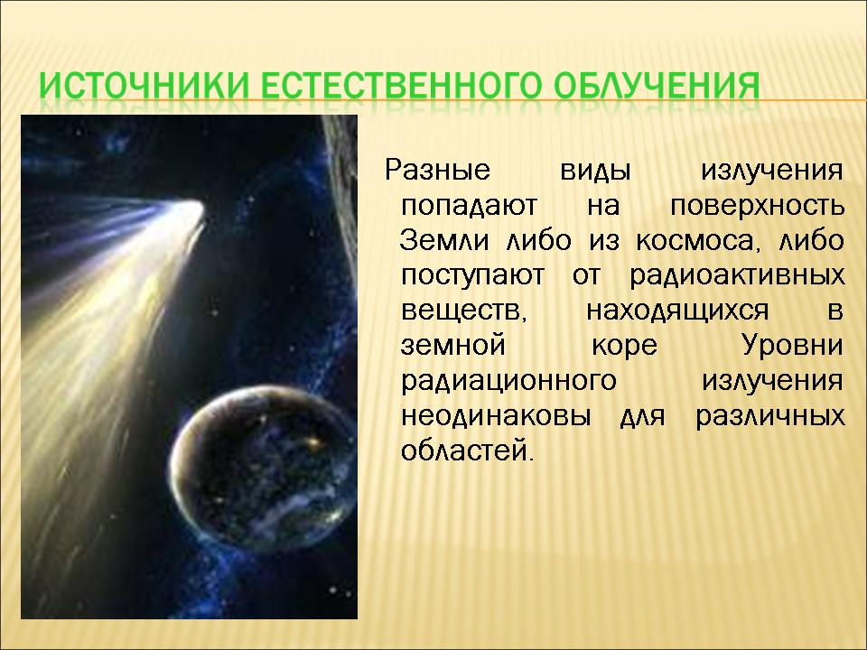Разные виды излучения попадают на поверхность Земли либо из космоса, либо поступают от радиоактивных веществ, находящихся в земной коре, причем земные источники ответственны в среднем за 5/6 годовой эффективной эквивалентной доз, получаемой населением, в основном вследствие внутреннего облучения. Уровни радиационного излучения неодинаковы для различных областей. Так, Северный и Южный полюсы более, чем экваториальная зона, подвержены воздействию космических лучей из-за наличия у Земли магнитного поля, отклоняющего заряженные радиоактивные частицы. Кроме того, чем больше удаление от земной поверхности, тем интенсивнее космическое излучение.