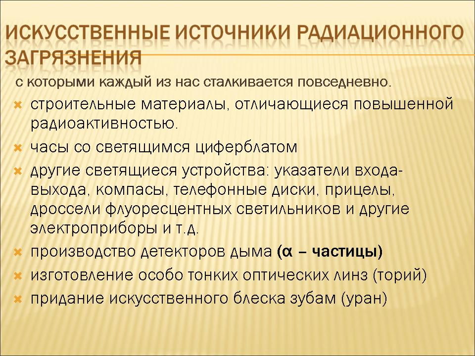 Искусственные: осадки после испытаний ядерного оружия, космическое излучение от полетов самолетов, рентгеновские лучи в медицине, выбросы атомной энергетики
