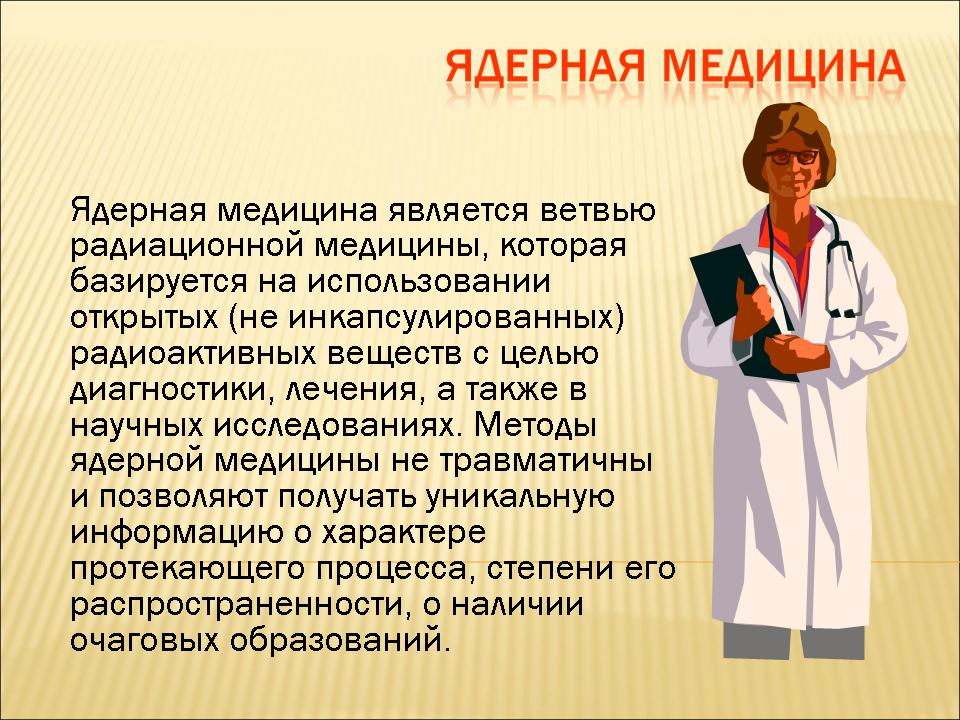 Ядерная медицина является ветвью радиационной медицины, которая базируется на использовании открытых (не инкапсулированных) радиоактивных веществ с целью диагностики, лечения, а также в научных исследованиях. Методы ядерной медицины не травматичны и позволяют получать уникальную информацию о характере протекающего процесса, степени его распространенности, о наличии очаговых образований.
