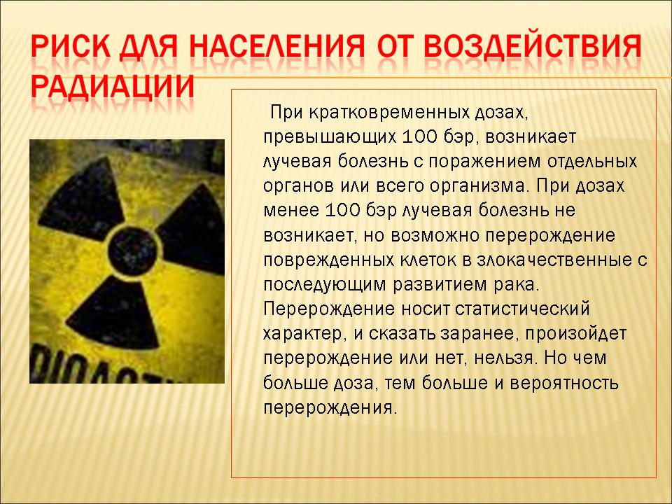 Риск для населения от воздействия радиации: при кратковременных дозах, превышающих 100 бэр, возникает лучевая болезнь с поражением отдельных органов или всего организма. При дозах менее 100 бэр лучевая болезнь не возникает, но возможно перерождение поврежденных клеток в злокачественные с последующим развитием рака. Перерождение носит статистический характер, и сказать заранее, произойдет перерождение или нет, нельзя. Но чем больше доза, тем больше и вероятность перерождения.