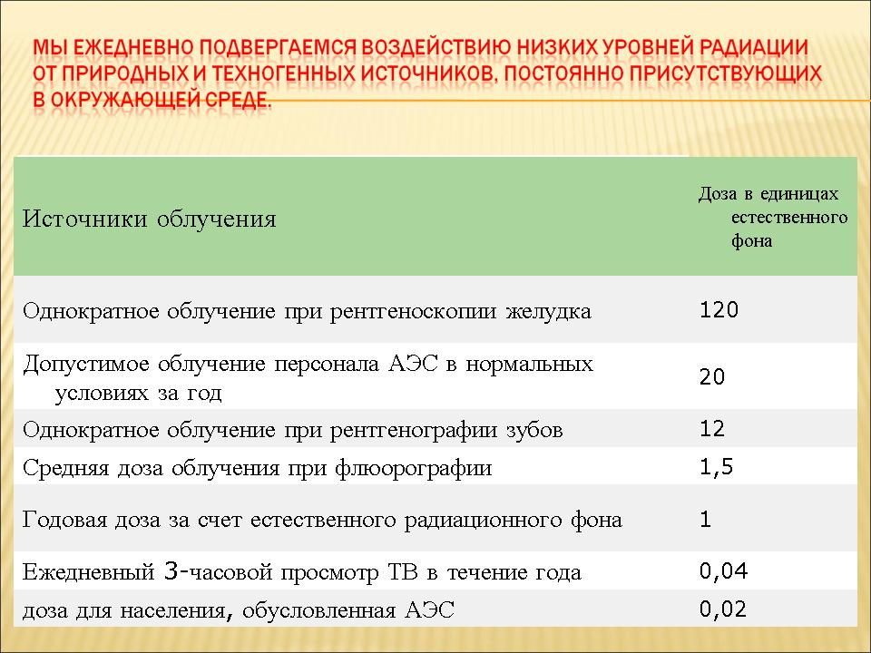 Таким образом, мы ежедневно подвергаемся воздействию низких уровней радиации от природных и техногенных источников, постоянно присутствующих в окружающей среде. Техногенные источники .Эффективная доза, мЗв в год Медицина 0.4 Ядерные испытания 0.005 Ядерная энергетика 0.0002 Источники облучения Доза в единицах естественного фона Однократное облучение при рентгеноскопии желудка120Допустимое облучение персонала АЭС в нормальных условиях за год 20Однократное облучение при рентгенографии зубов 12Средняя доза облучения при флюорографии 1,5Годовая доза за счет естественного радиационного фона 1Ежедневный 3-часовой просмотр ТВ в течение года 0,04ая доза для населения, обусловленная АЭС 0,02.