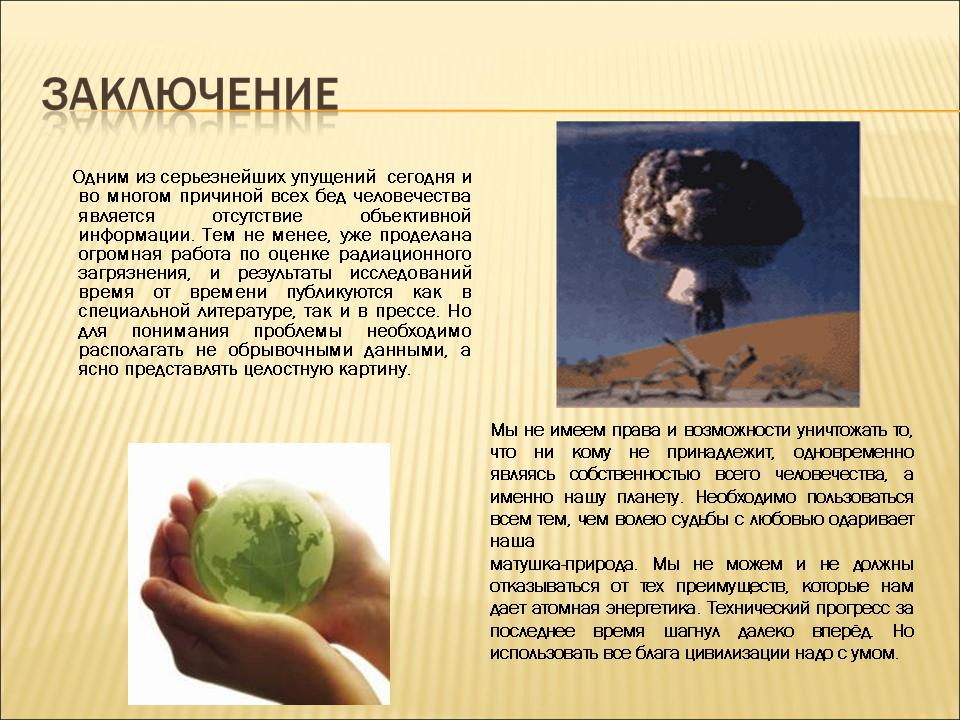 Мы не имеем права и возможности уничтожать то, что ни кому не принадлежит, одновременно являясь собственностью всего человечества, а именно нашу планету. Необходимо пользоваться всем тем, чем волею судьбы с любовью одаривает наша матушка-природа. Мы не можем и не должны отказываться от тех преимуществ, которые нам дает атомная энергетика. Технический прогресс за последнее время шагнул далеко вперёд. Но использовать все блага цивилизации надо с умом.
