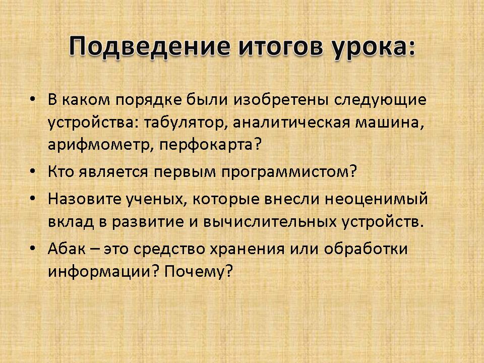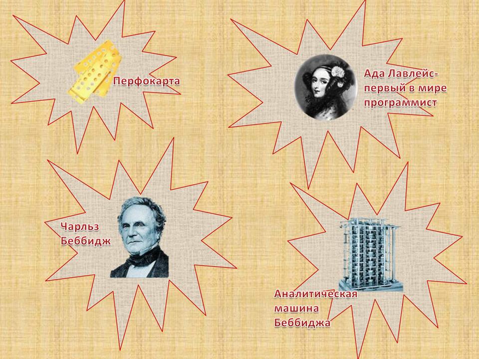 | 1. Арифмометр 2. Абак 3. Бэббидж 4. Лавлейс. |