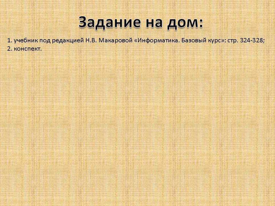 1. Учебник под редакцией Н.В. Макаровой “Информатика. Базовый курс”: стр. 324-328.
