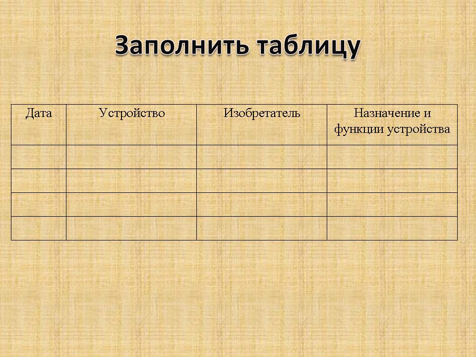 - Здравствуйте, ребята! Сегодня на уроке мы с вами познакомимся с открытиями и изобретениями, связанными с развитием вычислительной техники. В течение урока я буду иллюстрировать ваши сообщения слайдами. По ходу урока вам нужно будет заполнить следующую таблицу:
