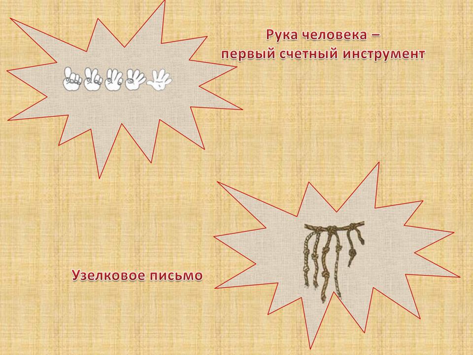 - На пальцах считать удобно, вот только результат долго хранить нельзя. Не станешь же целый день ходить с загнутыми пальцами. И человек догадался, что для счета можно использовать все, что попадется под руку: камешки, палочки, веревки и так далее.