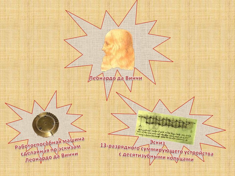 - Шло время, и потребности людей в обработке числовой информации возросли. Первые идеи механизации вычислительного процесса появилась в конце XV – начале XVI веков. Об этом свидетельствует найденный в конце 60-х годов прошлого века эскиз суммирующего устройства, разработанный еще Леонардо да Винчи.