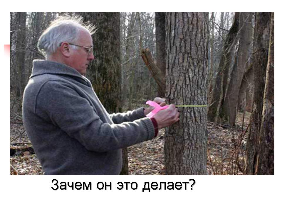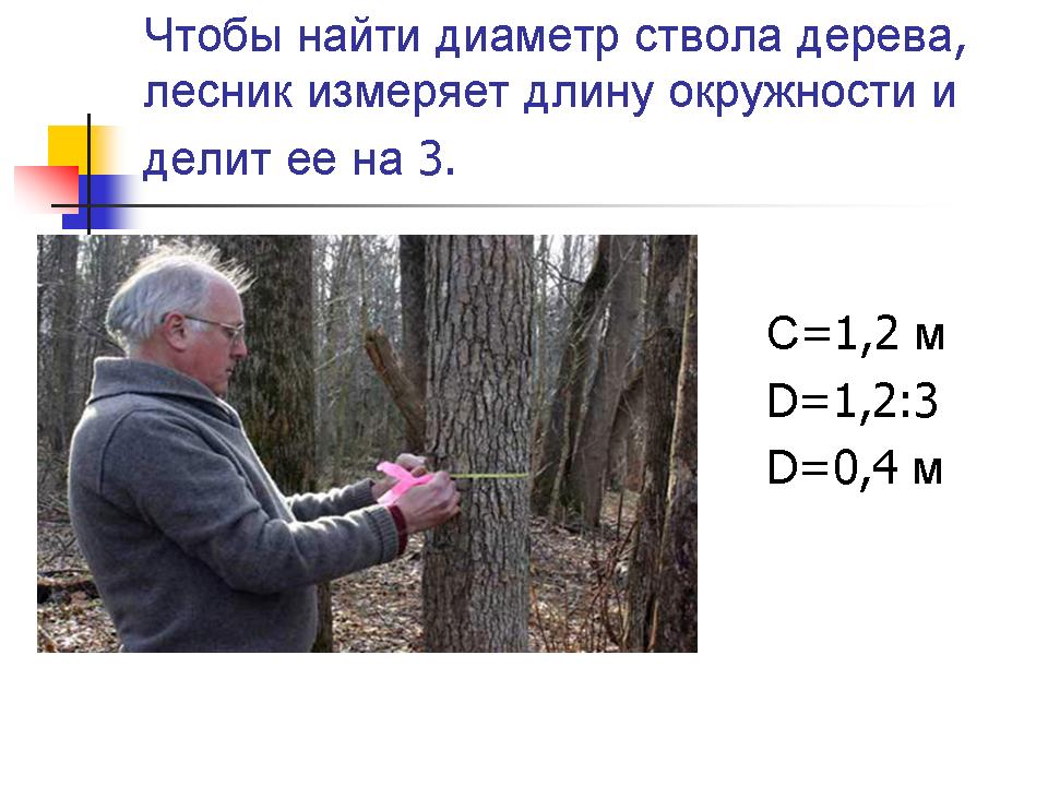 Проблемная задача: чтобы определить диаметр ствола дерева, лесник берет веревку и измеряет длину окружности ствола дерева. Как вы думаете, почему он так поступает? Какая связь между длиной окружности и ее диаметром? (Слайд №3)