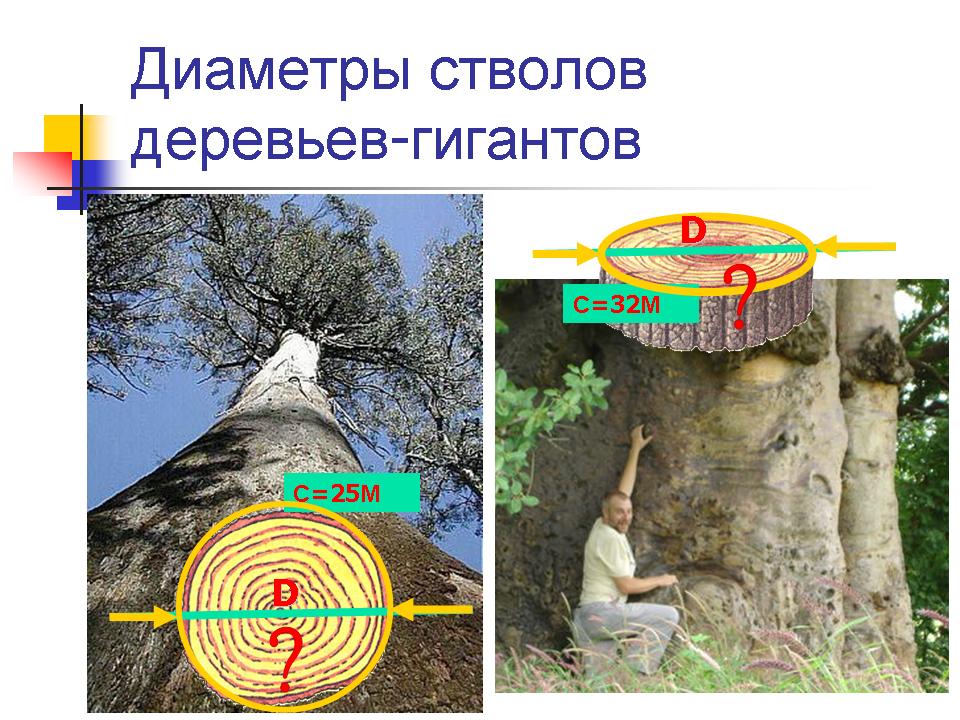 б) Устно вычислить диаметры стволов деревьев-гигантов у их оснований: а) эвкалипта, длина окружности которого 25 м; б) мамонтова дерева длина окружности которого 32 м. (Слайд №17)