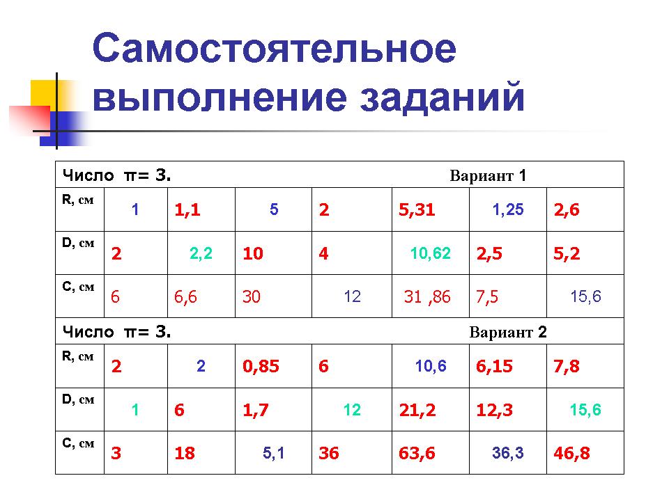 в) По учебнику № 847 одновременно 3 ученика выполняют на доске, остальные в тетрадях по вариантам: 1 вариант – r = 24 см, 2 вариант – r = 4,7 дм, 3 вариант – r = 18,5 м.