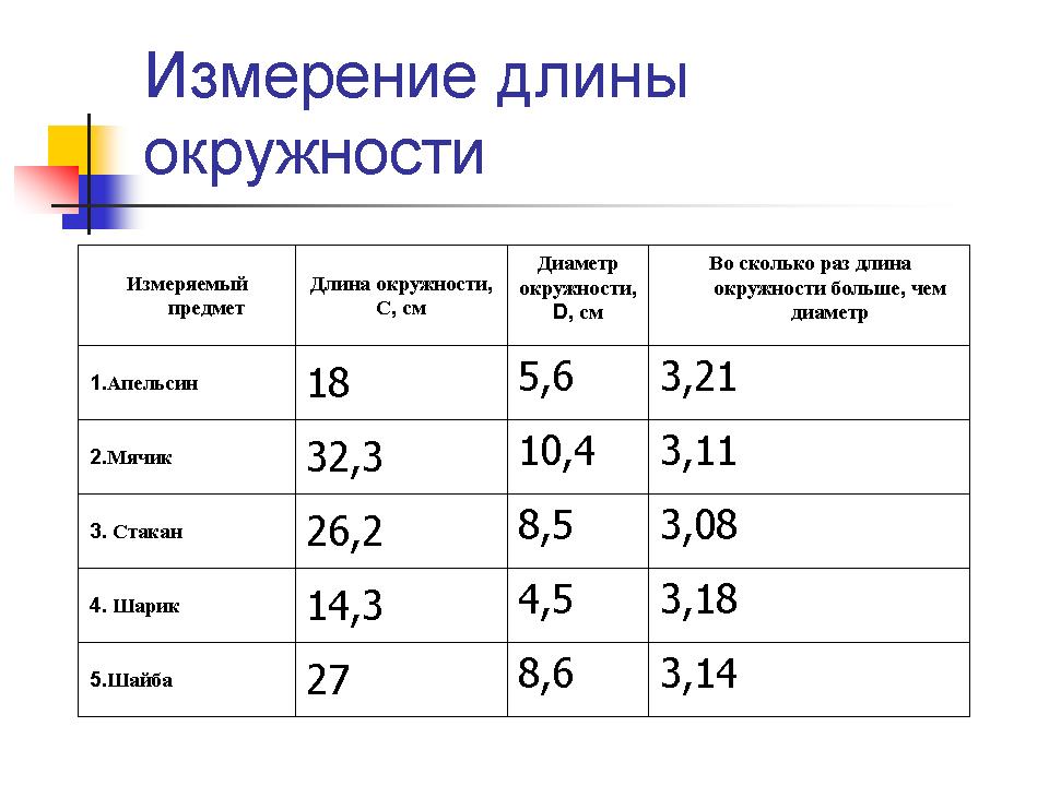 Берем первый предмет, измеряем его по окружности ниткой, затем распрямляем ее и измеряем линейкой. Результаты запишем в таблицу, с помощью калькулятора вычисляем, во сколько раз длина окружности больше длины диаметра и заполняем последний столбик, округляя результат до сотых долей. Аналогично ребята заполняют еще 4 строчки таблицы. На экране таблица тоже заполняется учителем.