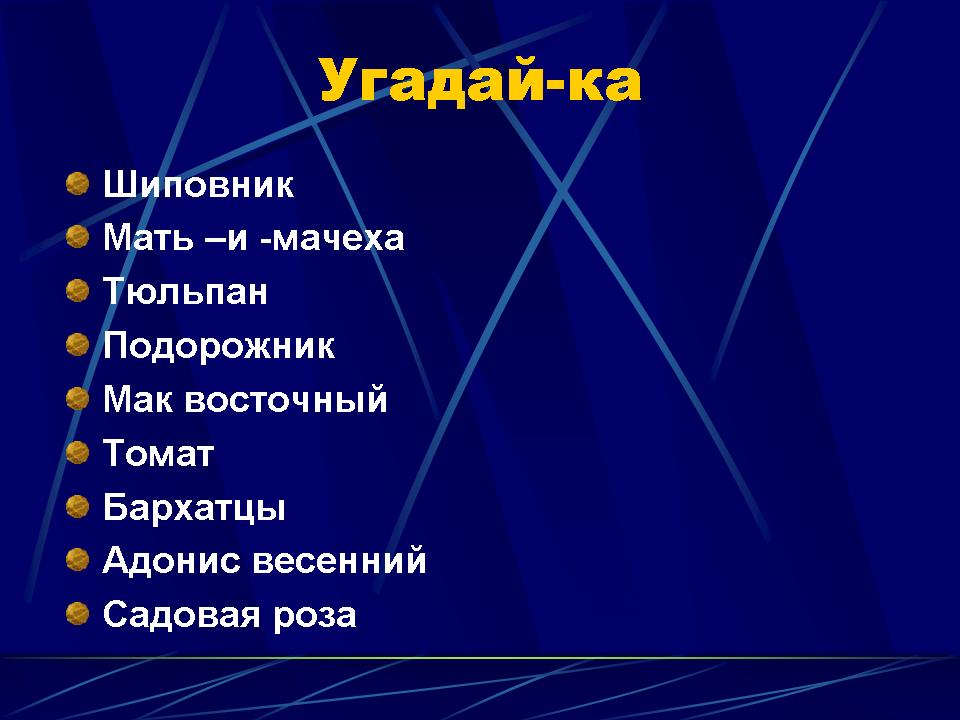 На экране написаны названия растений. (Используется интерактивная доска) (Шиповник, Мать - и – мачеха, Адонис весенний, Садовая роза, Мак восточный, Тюльпан, Томат, Подорожник, Бархатцы)