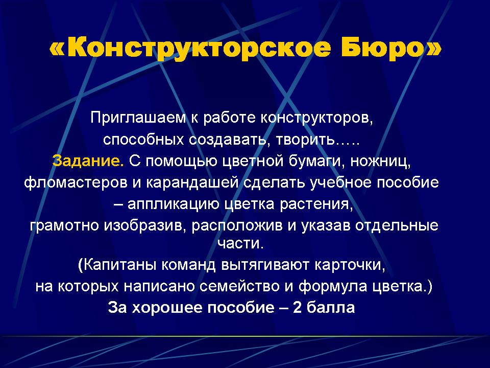 (Капитаны команд вытягивают карточки, на которых написано семейство и формула цветка.)
