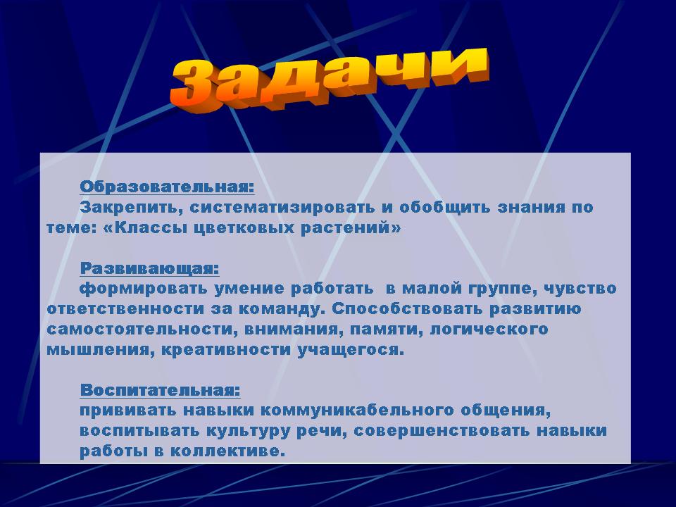 Воспитательные задачи: Содействовать трудовому и эстетическому воспитанию учеников, обращая их внимание на красоту проводимых опытов и т.д. Формировать умение работать в коллективе, развивать чувства товарищества, доброжелательности и требовательности к себе и своим товарищам.